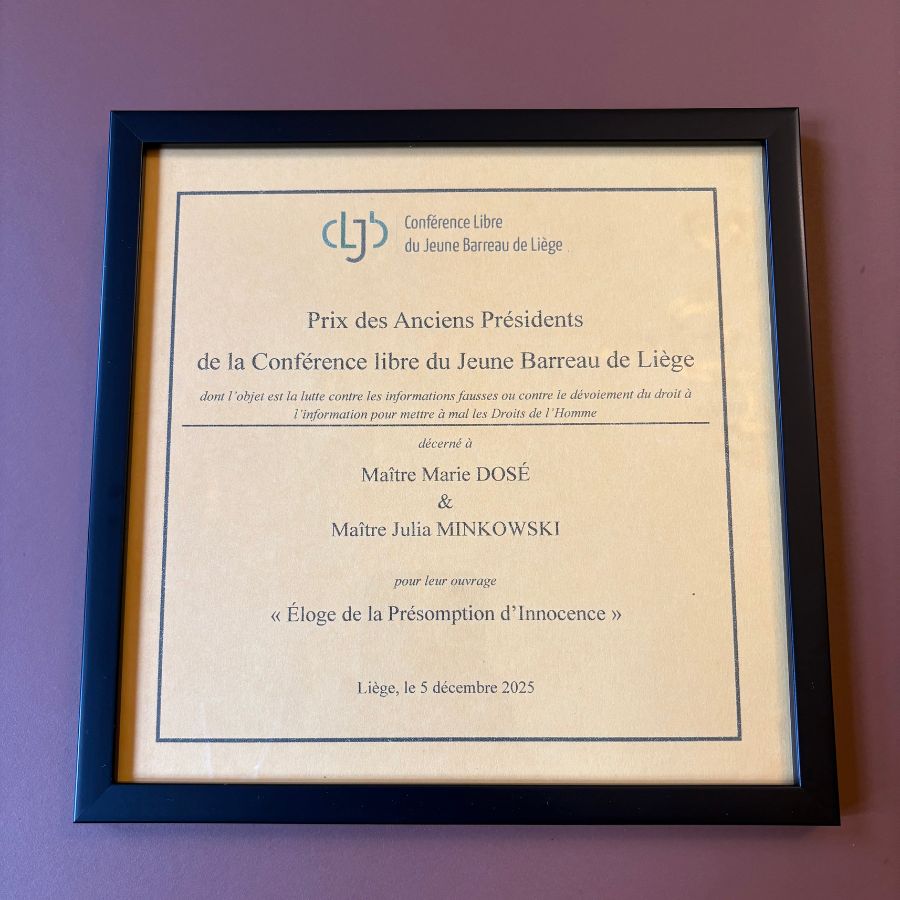 Le 5 décembre dernier, la Conférence libre du Jeune Barreau de Liège (CLJB) a décerné son prix à Maître Marie Dosé et Maître Julia Minkowski, avocates au barreau de Paris, pour leur ouvrage Éloge de la présomption d’innocence. Une distinction qui s’inscrit dans la continuité de l’histoire du prix, créé en 1990 par les anciens présidents de la CLJB afin de promouvoir une information respectueuse des droits fondamentaux, et récemment élargi à toute initiative contribuant à la lutte contre la désinformation et les atteintes à l’État de droit.